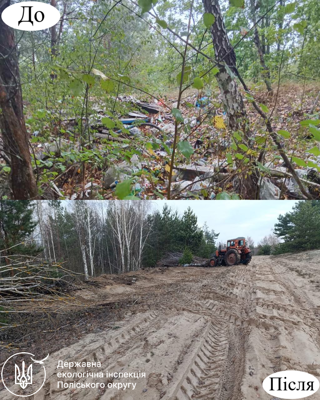 З метою усунення порушення Інспекцією скеровано лист до Філії «Поліський лісовий офіс» ДП «Ліси України» з вимогою ліквідувати виявлене несанкціоноване сміттєзвалище та з зауваженням щодо необхідності забезпечення виконання вимог статті 12 Закону України «Про управління відходами». На сьогодні Інспекцію поінформовано, що Філією «Поліський лісовий офіс» ДП «Ліси України» стихійне сміттєзвалище ліквідовано, територію приведено до належного санітарного стану.