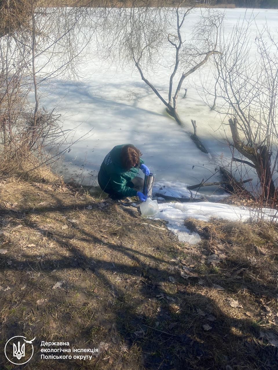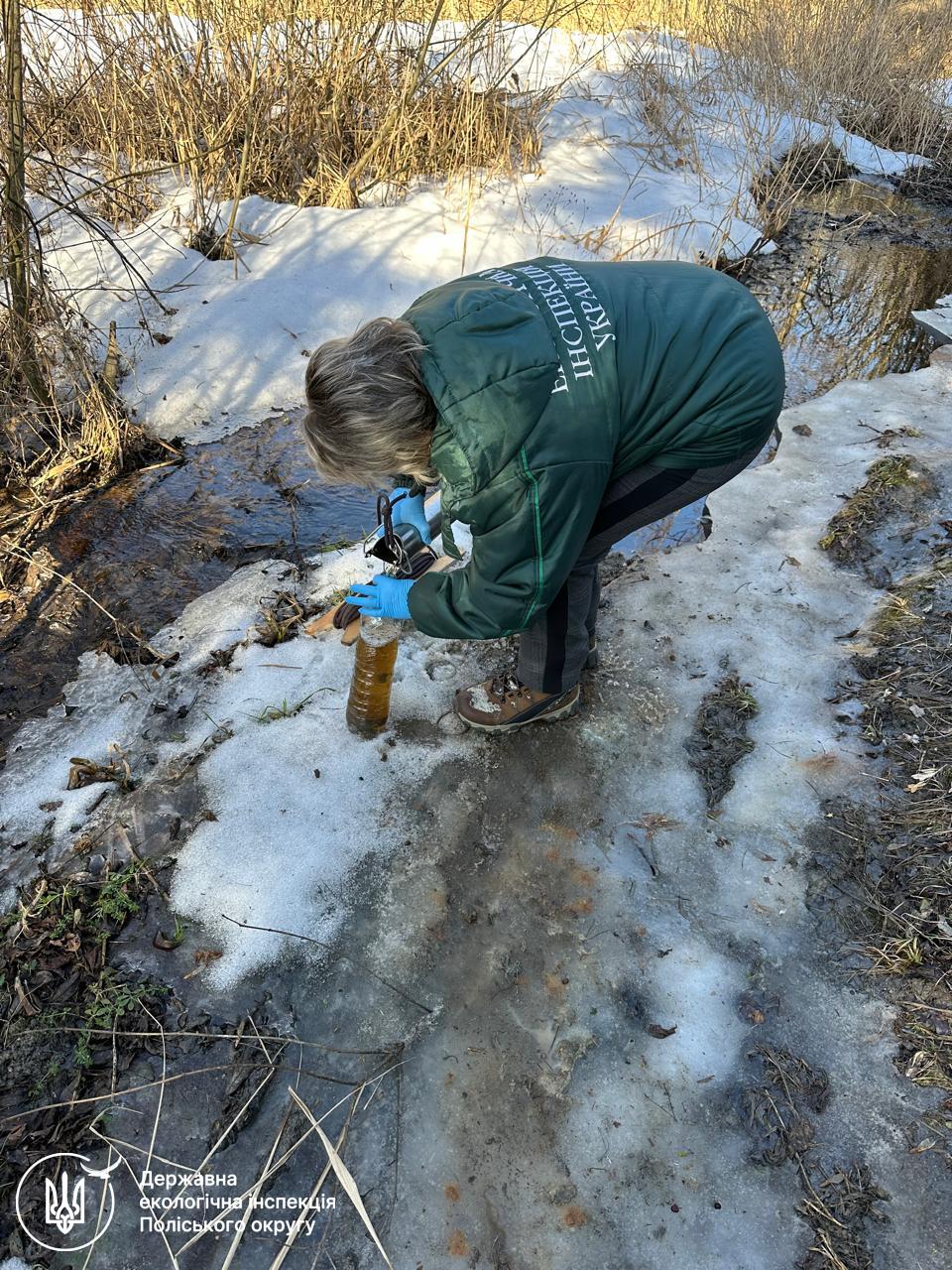Також під час патрулювання проведено відбір проб води з безіменного струмка у місті Житомирі - поблизу відстійника фільтрату полігону ТПВ та у місці його впадіння в річку Крошенку. Метою дослідження є встановлення можливого потрапляння неочищених стічних вод. Під час візуального огляду встановлено неприродне забарвлення води. Відібрані зразки передано до відділу інструментально-лабораторного контролю Інспекції.