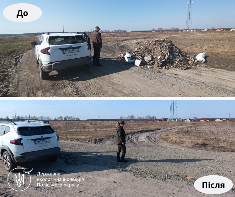 У межах контролю за виконанням раніше наданих вимог Інспекції встановлено ліквідацію несанкціонованого звалища змішаних відходів (будівельних, побутових та скла) на землях комунальної власності поблизу міста Сарни, а також двох стихійних звалищ побутових відходів поблизу села Глушиця.