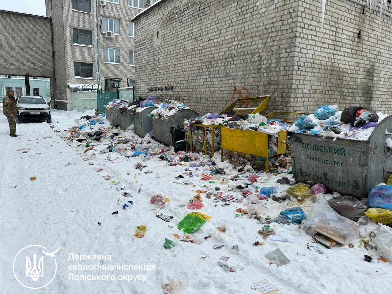 Під час патрулювання міста Житомир по вул. Святослава Ріхтера виявлено порушення правил поводження з відходами, а саме несвоєчасне вивезення сміття та його скидання на прилеглу територію, у тому числі на проїжджу частину. З цього приводу Інспекцією скеровано відповідний лист до Житомирської міської ради для вжиття заходів реагування.