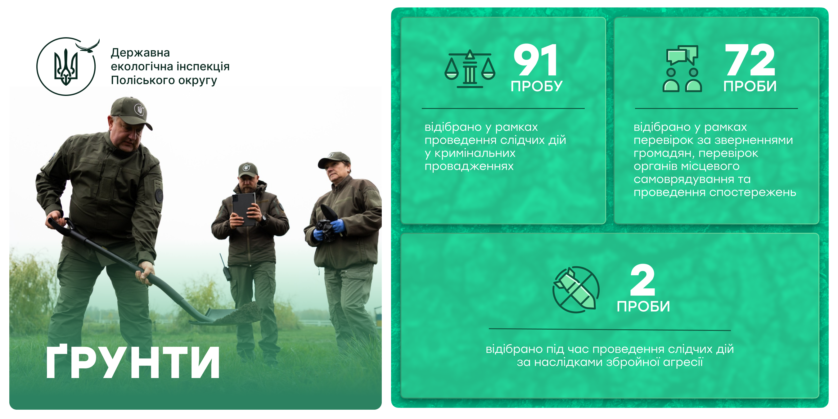 Окрім цього, 2 проби ґрунтів було відібрано під час слідчих дій за наслідками збройної агресії, що є важливим елементом документування та фіксації шкоди, завданої довкіллю.
