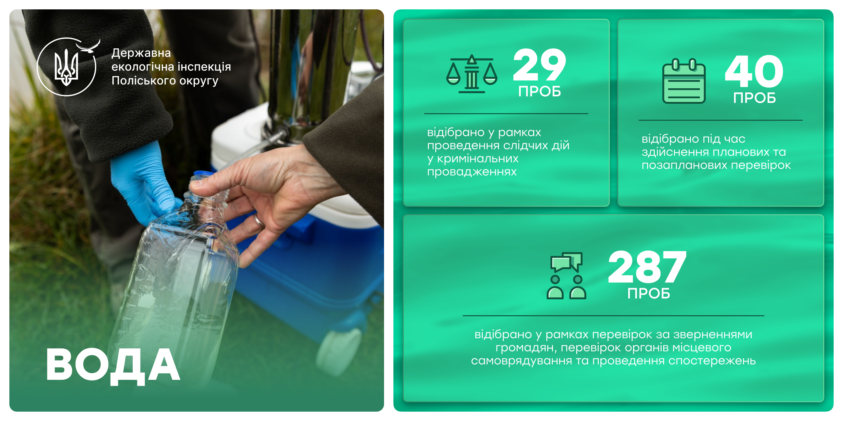 • 287 проб – у межах перевірок за зверненнями громадян, перевірок органів місцевого самоврядування та під час проведення спостережень за станом водних об’єктів.